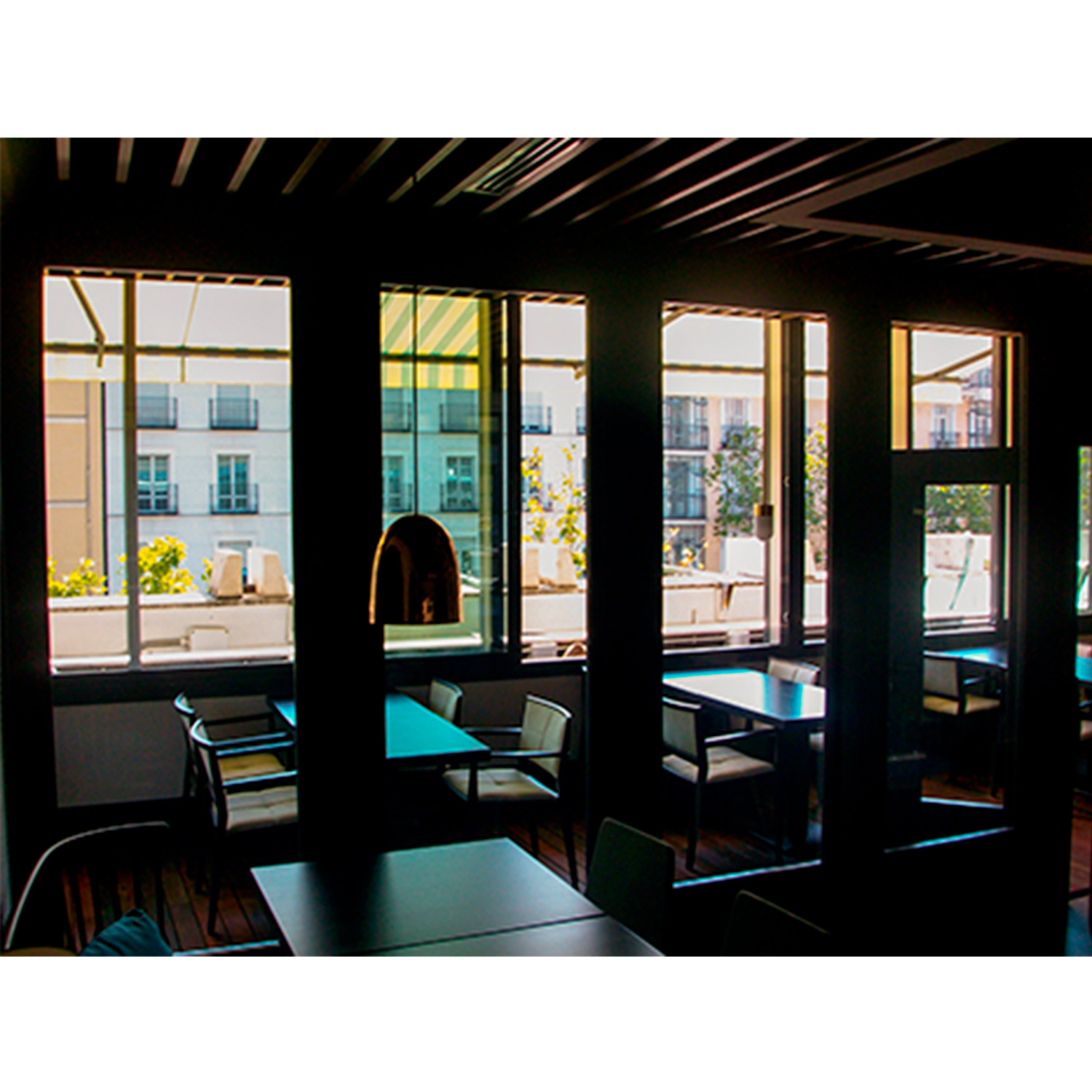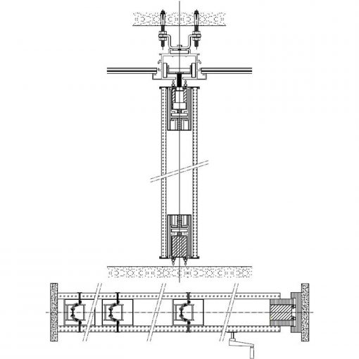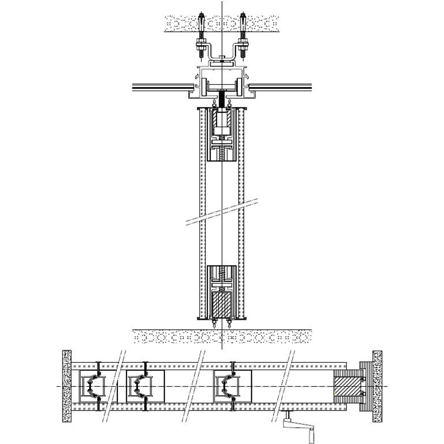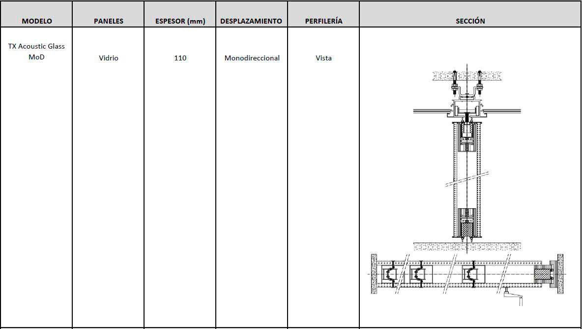 que va fijada la guia; con una polea por modulo que esta formada por 4 rodamientos polimericos y que, mediante tornillo roscado, facilita el cuelgue y movimiento del mismo; cada panel esta fabricado con una estructura autoportante de acero y aluminio que le confiere rigidez y resistencia, en cuyo interior se ubican los mecanismos telescopicos y el aislante acustico constituido por lana de roca de 60kg/m2 y membrana acustica M.A.D.2 de 3 kg/m3 en el caso en el que el vidrio no sea transparente. En sus caras exteriores se incluyen dos vidrios de 10 mm. o 12 mm. de espesor que pueden ser laminares o templados y cuya terminacion quedara determinada por la D.F. segun proyecto. Para el modulo de cierre telescopico y los modulos puerta, el acabado del vidrio ha de ser opaco ya que las transmisiones internas no se pueden ocultar perimetralmente. Modulos con mecanismos internos telescopicos de traviesas moviles superiores e inferiores accionados mediante un giro sencillo de llave, con juntas acusticas de neopreno horizontales y verticales que garantizan un sellado acustico y con bandas magneticas verticales que favorecen una perfecta union entre modulos; i/p.p. de estructura auxiliar de cuelgue y barrera fonica entre la guia y el forjado, totalmente colocado y funcionando. Panel de puertas simple de 1120 mm. de longitud aproximada e identico acabado al resto del tabique (opcional).