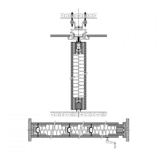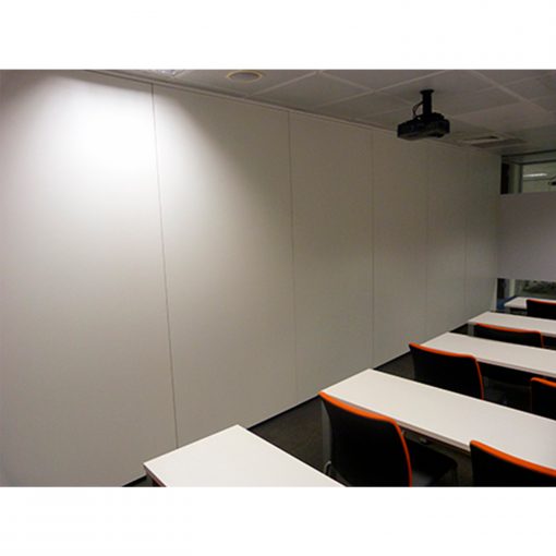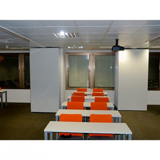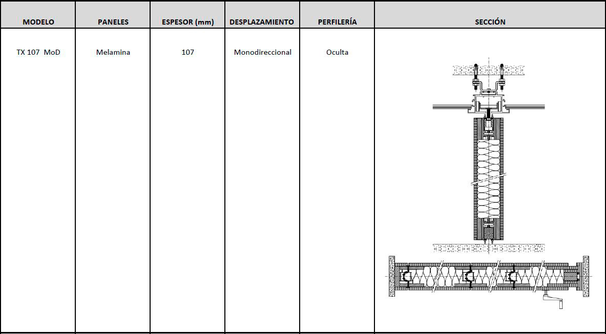 Tabique móvil TabieXpert modelo Tx107 Monodireccional, sin guía en el suelo y con el carril encastrado en el falso techo, compuesto por paneles estándar de entre 850 y 1200 mm. de longitud aproximada cada uno y un panel de cierre telescópico de entre 850 y 1200 mm. de longitud aproximada. Deslizables por un carril superior de aluminio extrusionado anodizado y lacado, integrado en el falso techo, anclado al forjado mediante tacos de expansión ó soldadura que permiten fijar la pletina de nivelación superior a la estructura y descolgar la guía mediante dos varillas roscadas que sujetan la pletina de nivelación inferior a la que va fijada la guía; con una polea por módulo que está formada por 4 rodamientos poliméricos y que, mediante tornillo roscado, facilita el cuelgue y movimiento del mismo; cada panel está fabricado con una estructura autoportante de acero y aluminio que le confiere rigidez y resistencia, en cuyo interior se ubican los mecanísmos telescópicos y el aislante acústico constituido por lana de roca de 60kg/m2 y membrana acústica M.A.D.2 de 3 kg/m3. En sus caras exteriores se incluyen dos tableros de partículas de 16 mm. de espesor y acabado a determinar por la D.F. según proyecto. Módulos con mecanísmos internos telescópicos de traviesas móviles superiores e inferiores accionados mediante un giro sencillo de llave, con juntas acústicas de neopreno horizontales y verticales que garantizan un sellado acústico y con bandas magnéticas verticales que favorecen una perfecta unión entre módulos; i/p.p. de estructura auxiliar de cuelgue y barrera fónica entre la guía y el forjado, totalmente colocado y funcionando. Panel de puertas simple de 1120 mm. de longitud aproximada e idéntico acabado al resto del tabique (opcional).
