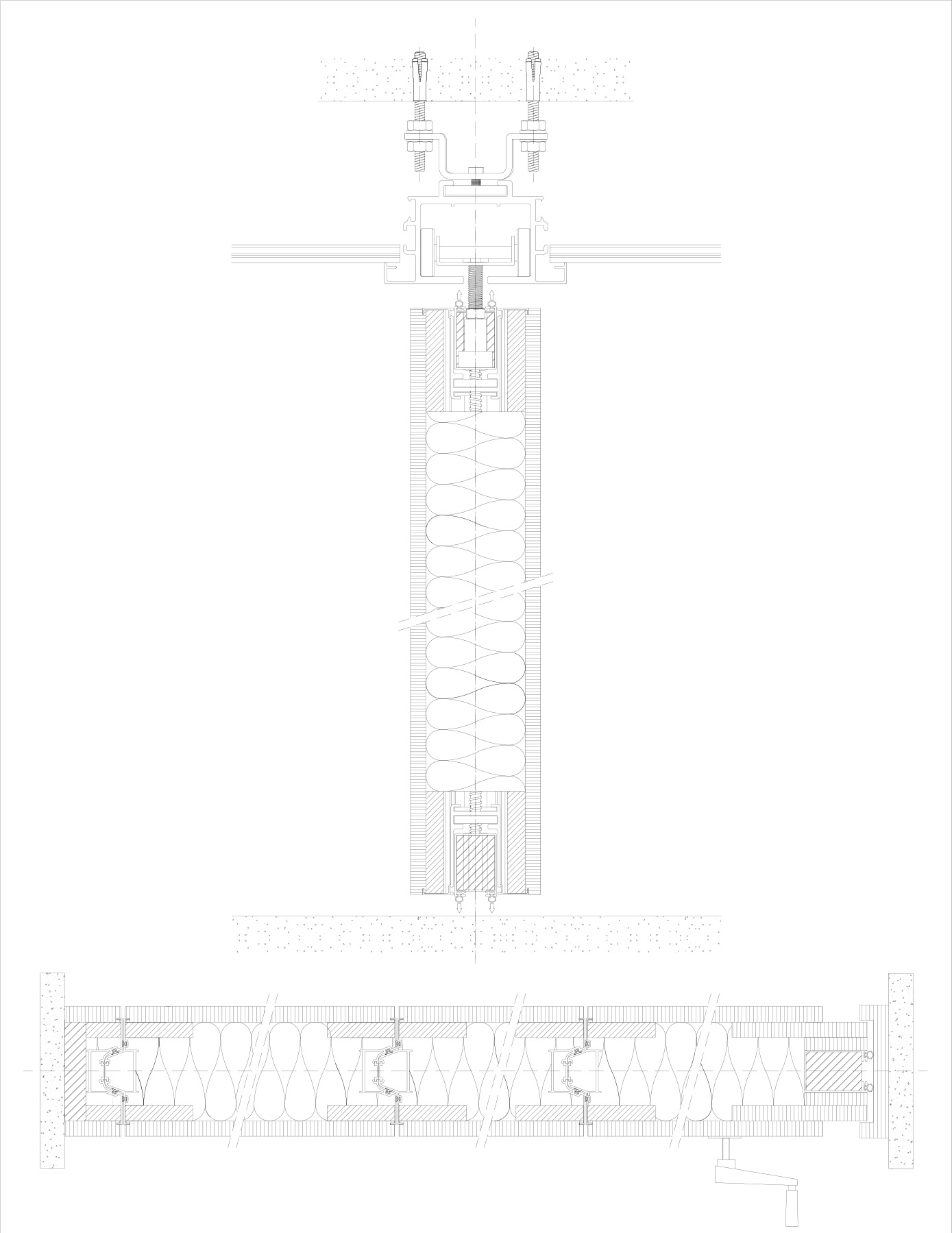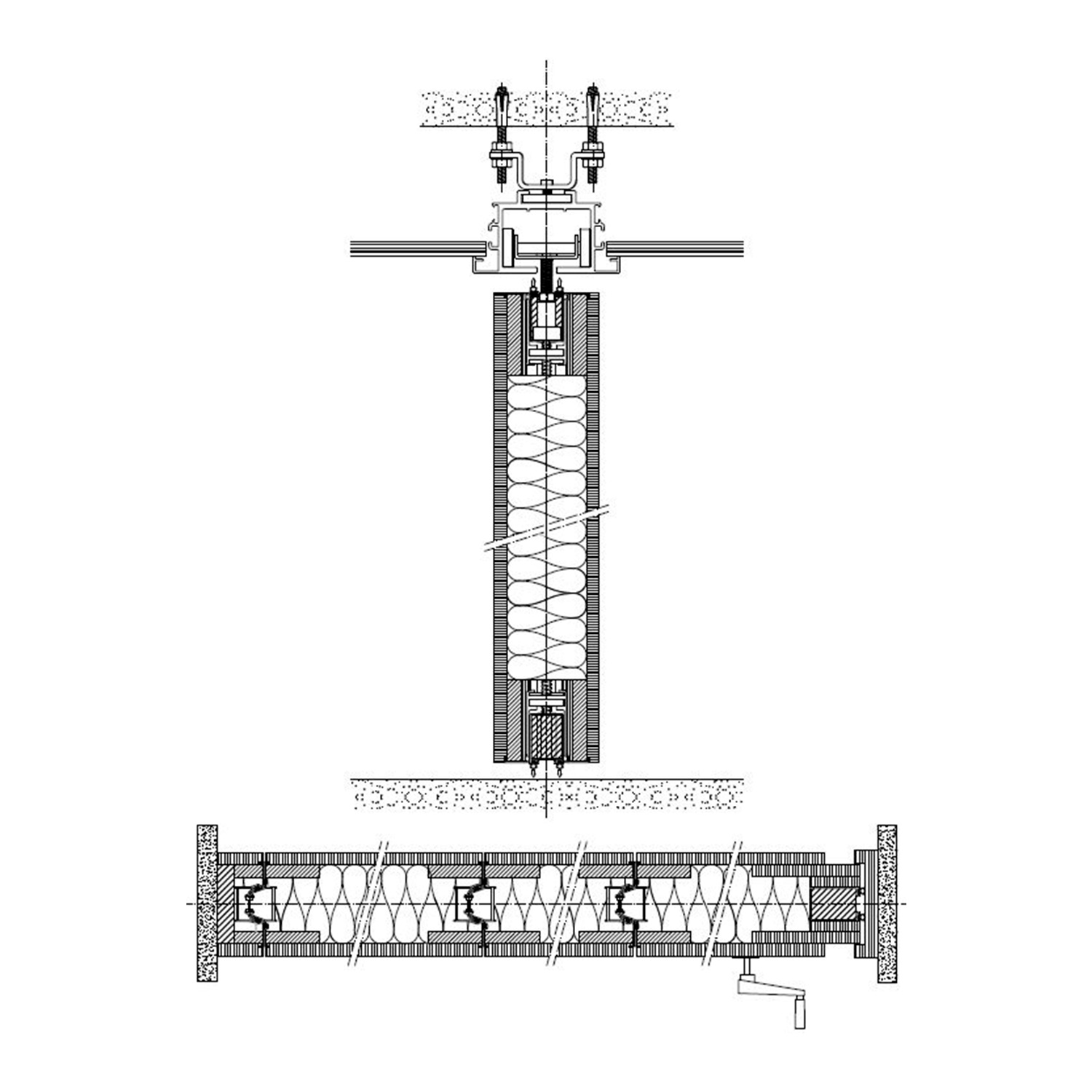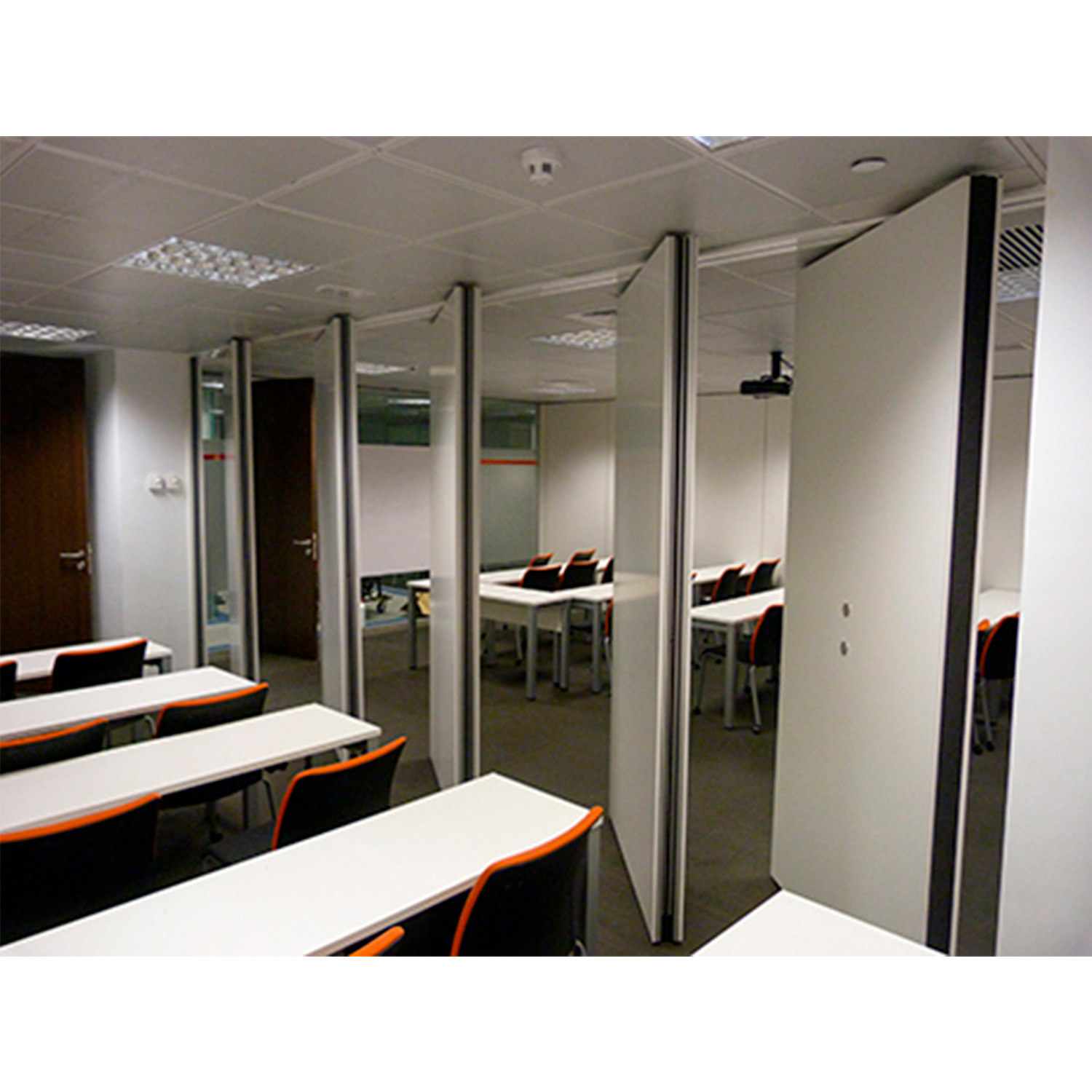 Tabique móvil TabieXpert modelo Tx107 Monodireccional, sin guía en el suelo y con el carril encastrado en el falso techo, compuesto por paneles estándar de entre 850 y 1200 mm. de longitud aproximada cada uno y un panel de cierre telescópico de entre 850 y 1200 mm. de longitud aproximada. Deslizables por un carril superior de aluminio extrusionado anodizado y lacado, integrado en el falso techo, anclado al forjado mediante tacos de expansión ó soldadura que permiten fijar la pletina de nivelación superior a la estructura y descolgar la guía mediante dos varillas roscadas que sujetan la pletina de nivelación inferior a la que va fijada la guía; con una polea por módulo que está formada por 4 rodamientos poliméricos y que, mediante tornillo roscado, facilita el cuelgue y movimiento del mismo; cada panel está fabricado con una estructura autoportante de acero y aluminio que le confiere rigidez y resistencia, en cuyo interior se ubican los mecanísmos telescópicos y el aislante acústico constituido por lana de roca de 60kg/m2 y membrana acústica M.A.D.2 de 3 kg/m3. En sus caras exteriores se incluyen dos tableros de partículas de 16 mm. de espesor y acabado a determinar por la D.F. según proyecto. Módulos con mecanísmos internos telescópicos de traviesas móviles superiores e inferiores accionados mediante un giro sencillo de llave, con juntas acústicas de neopreno horizontales y verticales que garantizan un sellado acústico y con bandas magnéticas verticales que favorecen una perfecta unión entre módulos; i/p.p. de estructura auxiliar de cuelgue y barrera fónica entre la guía y el forjado, totalmente colocado y funcionando. Panel de puertas simple de 1120 mm. de longitud aproximada e idéntico acabado al resto del tabique (opcional).