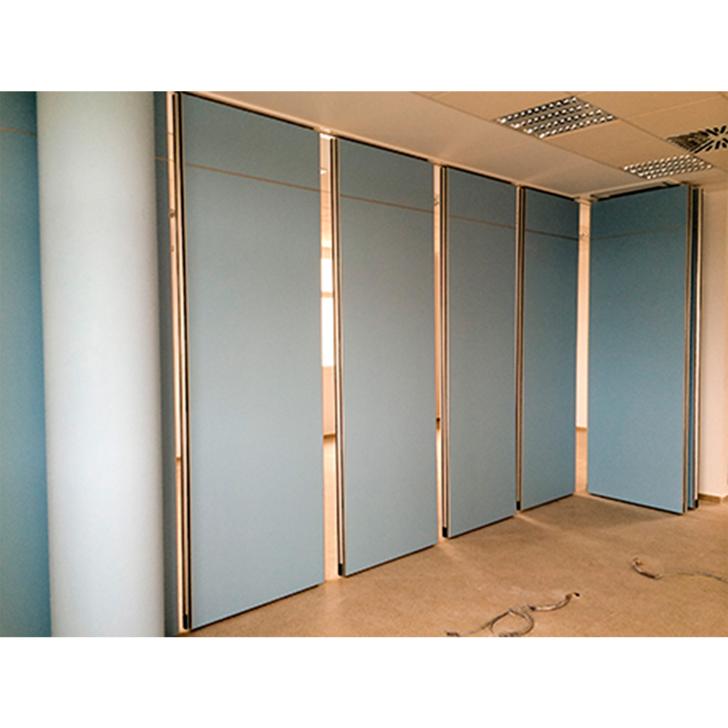Tabique móvil TabieXpert modelo Tx110 Multidireccional, sin guía en el suelo y con el carril encastrado en el falso techo, compuesto por paneles estándar de entre 850 y 1200 mm. de longitud aproximada cada uno y un panel de cierre telescópico de entre 850 y 1200 mm. de longitud aproximada. Deslizables por un carril superior de aluminio extrusionado anodizado y lacado, integrado en el falso techo, anclado al forjado mediante tacos de expansión ó soldadura que permiten fijar la pletina de nivelación superior a la estructura y descolgar la guía mediante dos varillas roscadas que sujetan la pletina de nivelación inferior a la que va fijada la guía; con dos poleas por módulo formadas por un doble rodamiento polimérico cada una y que, mediante tornillo roscado, facilita el cuelgue y movimiento del mismo; cada panel está fabricado con una estructura autoportante de acero y aluminio que le confiere rigidez y resistencia, en cuyo interior se ubican los mecanísmos telescópicos y el aislante acústico constituido por lana de roca de 60kg/m2 y membrana acústica M.A.D.2 de 3 kg/m3 . En sus caras exteriores se incluyen dos tableros de partículas de 16 mm. de espesor y acabado a determinar por la D.F. según proyecto. Módulos con mecanísmos internos telescópicos de traviesas móviles superiores e inferiores accionados mediante un giro sencillo de llave, con juntas acústicas de neopreno horizontales y verticales que garantizan un sellado acústico y con bandas magnéticas verticales que favorecen una perfecta unión entre módulos; i/p.p. de estructura auxiliar de cuelgue y barrera fónica entre la guía y el forjado, totalmente colocado y funcionando. Panel de puertas simple de 1120 mm. de longitud aproximada e idéntico acabado al resto del tabique (opcional).