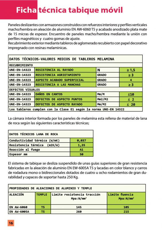 Tabique móvil TabieXpert modelo Tx142 Multidireccional, sin guía en el suelo y con el carril encastrado en el falso techo, compuesto por paneles estándar de entre 850 y 1200 mm. de longitud aproximada cada uno y un panel de cierre telescópico de entre 850 y 1200 mm. de longitud aproximada. Deslizables por un carril superior de aluminio extrusionado anodizado y lacado, integrado en el falso techo, anclado al forjado mediante tacos de expansión ó soldadura que permiten fijar la pletina de nivelación superior a la estructura y descolgar la guía mediante dos varillas roscadas que sujetan la pletina de nivelación inferior a la que va fijada la guía; con dos poleas por módulo formadas por un doble rodamiento polimérico cada una y que, mediante tornillo roscado, facilita el cuelgue y movimiento del mismo; cada panel está fabricado con una estructura autoportante de acero y aluminio que le confiere rigidez y resistencia, en cuyo interior se ubican los mecanísmos telescópicos y el aislante acústico constituido por lana de roca de 60kg/m2 y membrana acústica M.A.D.2 de 3 kg/m3 . En sus caras exteriores se incluyen dos tableros de partículas de 16 mm. de espesor y acabado a determinar por la D.F. según proyecto. Módulos con mecanísmos internos telescópicos de traviesas móviles superiores e inferiores accionados mediante un giro sencillo de llave, con juntas acústicas de neopreno horizontales y verticales que garantizan un sellado acústico y con bandas magnéticas verticales que favorecen una perfecta unión entre módulos; i/p.p. de estructura auxiliar de cuelgue y barrera fónica entre la guía y el forjado, totalmente colocado y funcionando. Panel de puertas simple de 1120 mm. de longitud aproximada e idéntico acabado al resto del tabique (opcional).