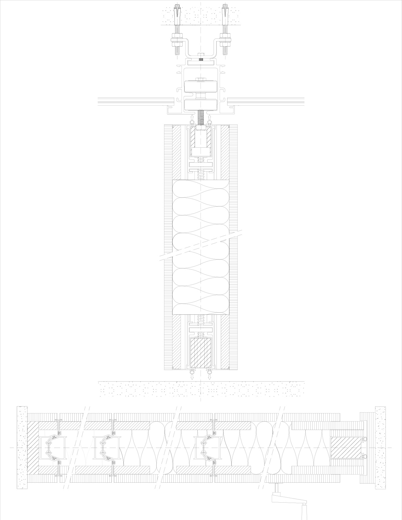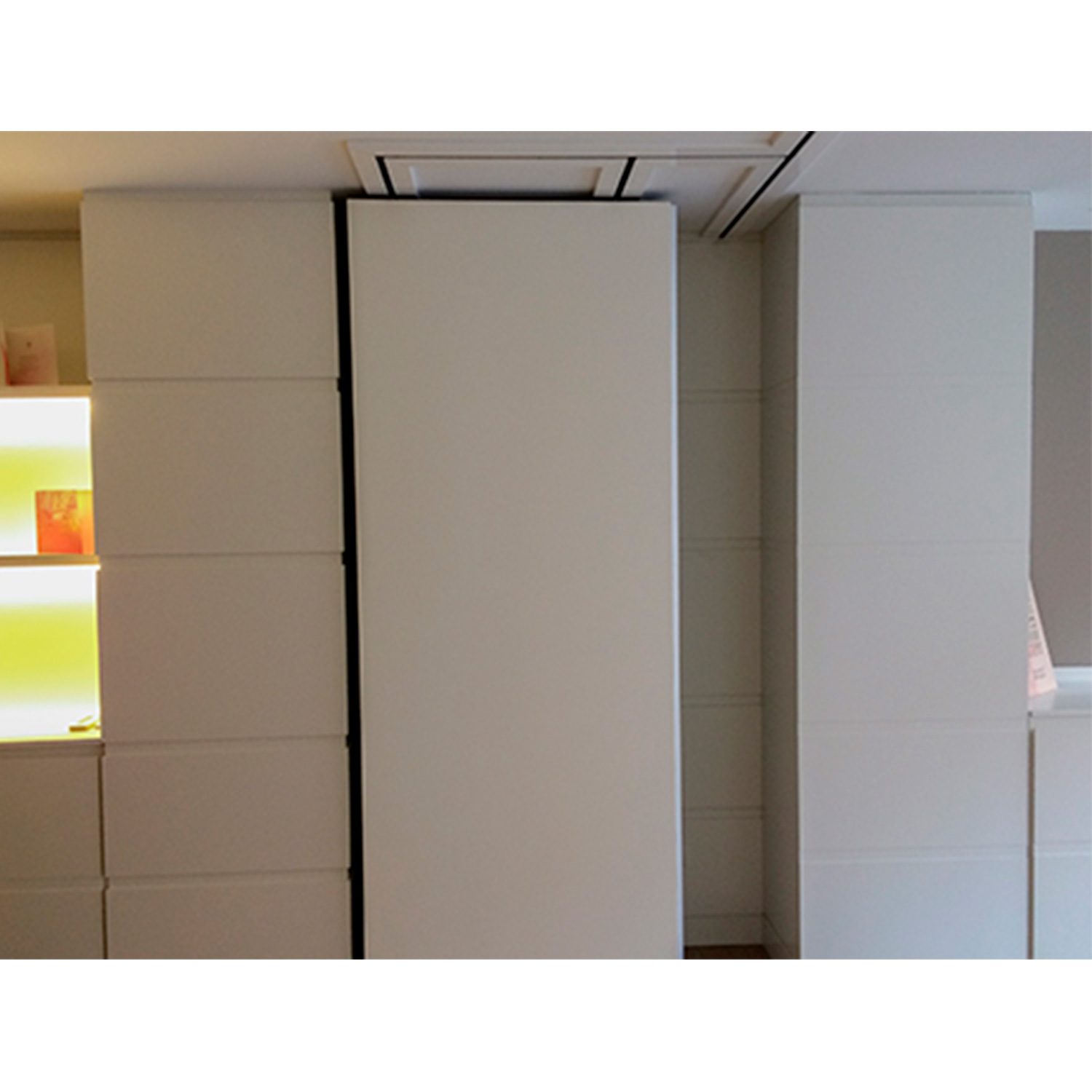 Tabique móvil TabieXpert modelo Tx142 Multidireccional, sin guía en el suelo y con el carril encastrado en el falso techo, compuesto por paneles estándar de entre 850 y 1200 mm. de longitud aproximada cada uno y un panel de cierre telescópico de entre 850 y 1200 mm. de longitud aproximada. Deslizables por un carril superior de aluminio extrusionado anodizado y lacado, integrado en el falso techo, anclado al forjado mediante tacos de expansión ó soldadura que permiten fijar la pletina de nivelación superior a la estructura y descolgar la guía mediante dos varillas roscadas que sujetan la pletina de nivelación inferior a la que va fijada la guía; con dos poleas por módulo formadas por un doble rodamiento polimérico cada una y que, mediante tornillo roscado, facilita el cuelgue y movimiento del mismo; cada panel está fabricado con una estructura autoportante de acero y aluminio que le confiere rigidez y resistencia, en cuyo interior se ubican los mecanísmos telescópicos y el aislante acústico constituido por lana de roca de 60kg/m2 y membrana acústica M.A.D.2 de 3 kg/m3 . En sus caras exteriores se incluyen dos tableros de partículas de 16 mm. de espesor y acabado a determinar por la D.F. según proyecto. Módulos con mecanísmos internos telescópicos de traviesas móviles superiores e inferiores accionados mediante un giro sencillo de llave, con juntas acústicas de neopreno horizontales y verticales que garantizan un sellado acústico y con bandas magnéticas verticales que favorecen una perfecta unión entre módulos; i/p.p. de estructura auxiliar de cuelgue y barrera fónica entre la guía y el forjado, totalmente colocado y funcionando. Panel de puertas simple de 1120 mm. de longitud aproximada e idéntico acabado al resto del tabique (opcional).