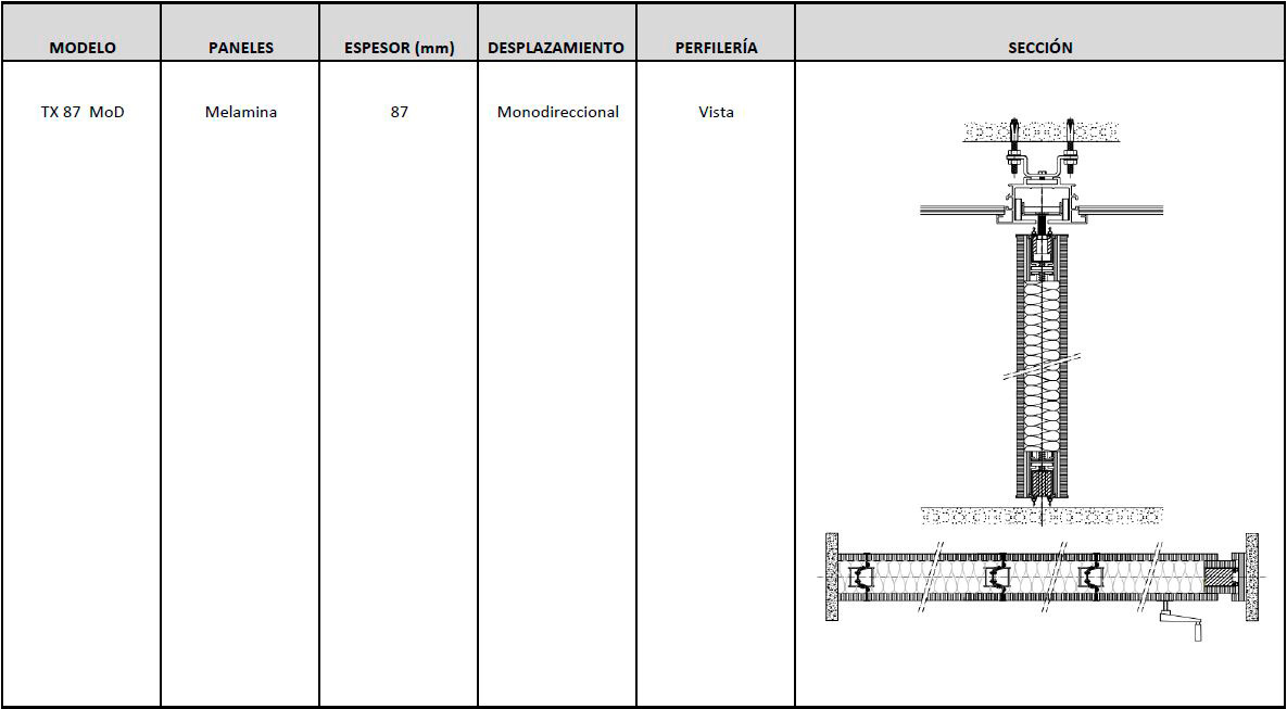Tabique móvil TabieXpert modelo Tx87 Monodireccional, sin guía en el suelo y con el carril encastrado en el falso techo, compuesto por paneles estándar de entre 850 y 1200 mm. de longitud aproximada cada uno y un panel de cierre telescópico de entre 850 y 1200 mm. de longitud aproximada. Deslizables por un carril superior de aluminio extrusionado anodizado y lacado, integrado en el falso techo, anclado al forjado mediante tacos de expansión ó soldadura que permiten fijar la pletina de nivelación superior a la estructura y descolgar la guía mediante dos varillas roscadas que sujetan la pletina de nivelación inferior a la que va fijada la guía; con una polea por módulo que está formada por 4 rodamientos poliméricos y que, mediante tornillo roscado, facilita el cuelgue y movimiento del mismo; cada panel está fabricado con una estructura autoportante de acero y aluminio que le confiere rigidez y resistencia, en cuyo interior se ubican los mecanísmos telescópicos y el aislante acústico constituido por lana de roca de 60kg/m2. En sus caras exteriores se incluyen dos tableros de partículas de 16 mm. de espesor y acabado a determinar por la D.F. según proyecto. Módulos con mecanísmos internos telescópicos de traviesas móviles superiores e inferiores accionados mediante un giro sencillo de llave, con juntas acústicas de neopreno horizontales y verticales que garantizan un sellado acústico y con bandas magnéticas verticales que favorecen una perfecta unión entre módulos; i/p.p. de estructura auxiliar de cuelgue y barrera fónica entre la guía y el forjado, totalmente colocado y funcionando. Panel de puertas simple de 1120 mm. de longitud aproximada e idéntico acabado al resto del tabique (opcional).