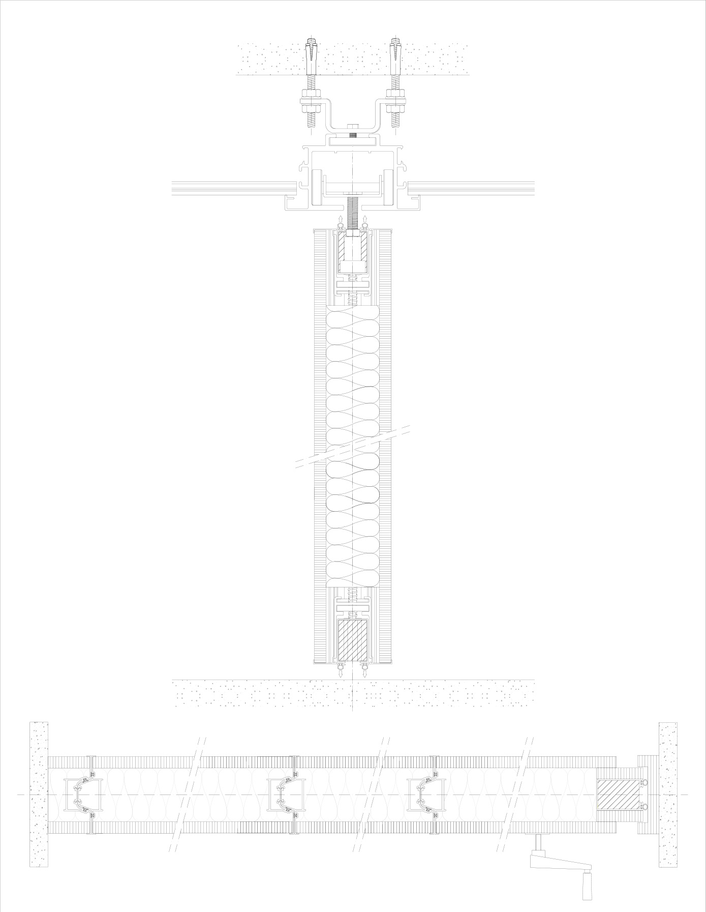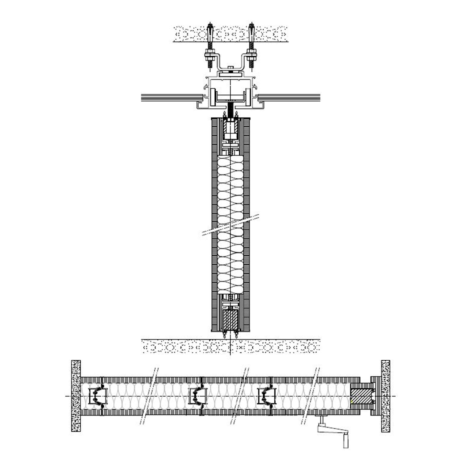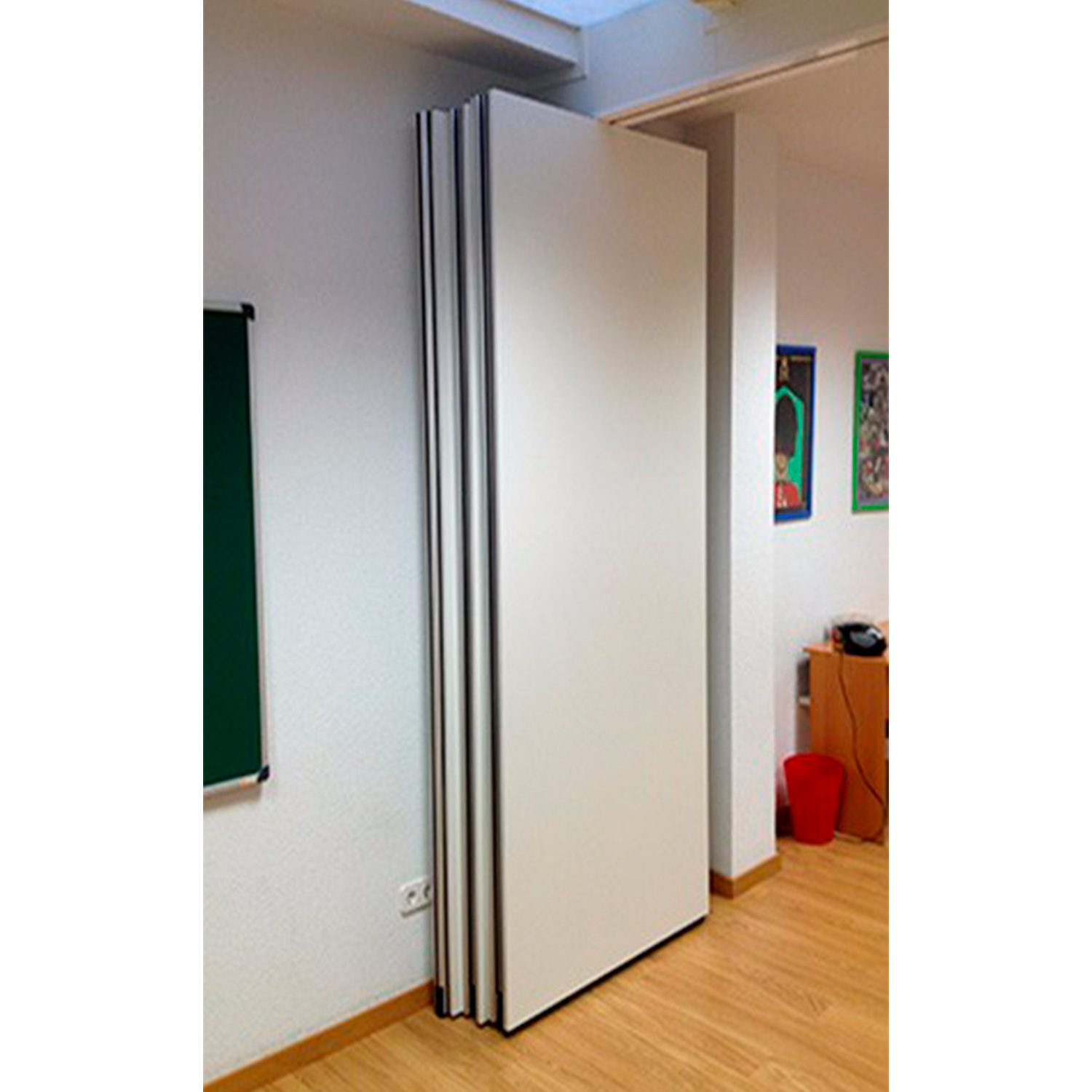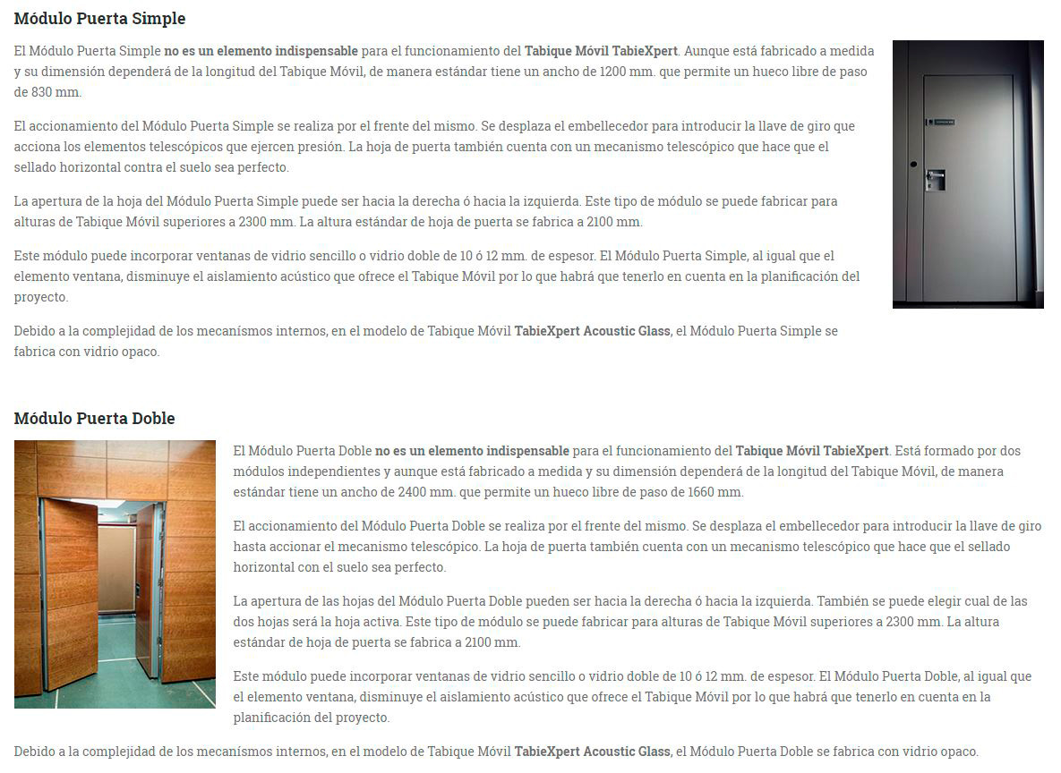 Tabique móvil TabieXpert modelo Tx87 Monodireccional, sin guía en el suelo y con el carril encastrado en el falso techo, compuesto por paneles estándar de entre 850 y 1200 mm. de longitud aproximada cada uno y un panel de cierre telescópico de entre 850 y 1200 mm. de longitud aproximada. Deslizables por un carril superior de aluminio extrusionado anodizado y lacado, integrado en el falso techo, anclado al forjado mediante tacos de expansión ó soldadura que permiten fijar la pletina de nivelación superior a la estructura y descolgar la guía mediante dos varillas roscadas que sujetan la pletina de nivelación inferior a la que va fijada la guía; con una polea por módulo que está formada por 4 rodamientos poliméricos y que, mediante tornillo roscado, facilita el cuelgue y movimiento del mismo; cada panel está fabricado con una estructura autoportante de acero y aluminio que le confiere rigidez y resistencia, en cuyo interior se ubican los mecanísmos telescópicos y el aislante acústico constituido por lana de roca de 60kg/m2. En sus caras exteriores se incluyen dos tableros de partículas de 16 mm. de espesor y acabado a determinar por la D.F. según proyecto. Módulos con mecanísmos internos telescópicos de traviesas móviles superiores e inferiores accionados mediante un giro sencillo de llave, con juntas acústicas de neopreno horizontales y verticales que garantizan un sellado acústico y con bandas magnéticas verticales que favorecen una perfecta unión entre módulos; i/p.p. de estructura auxiliar de cuelgue y barrera fónica entre la guía y el forjado, totalmente colocado y funcionando. Panel de puertas simple de 1120 mm. de longitud aproximada e idéntico acabado al resto del tabique (opcional).