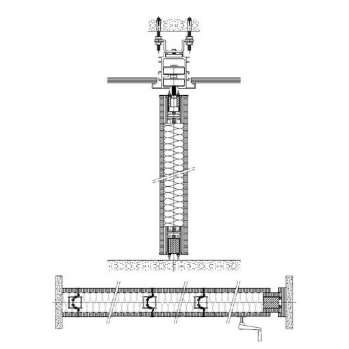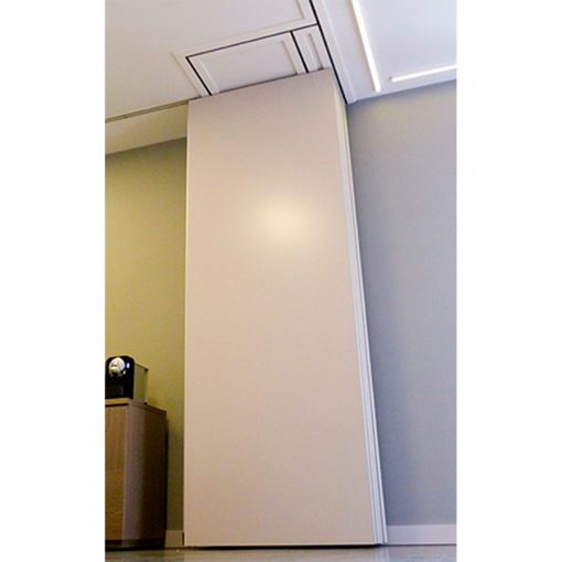Tabique móvil TabieXpert modelo Tx87 Multidireccional, sin guía en el suelo y con el carril encastrado en el falso techo, compuesto por paneles estándar de entre 850 y 1200 mm. de longitud aproximada cada uno y un panel de cierre telescópico de entre 850 y 1200 mm. de longitud aproximada. Deslizables por un carril superior de aluminio extrusionado anodizado y lacado, integrado en el falso techo, anclado al forjado mediante tacos de expansión ó soldadura que permiten fijar la pletina de nivelación superior a la estructura y descolgar la guía mediante dos varillas roscadas que sujetan la pletina de nivelación inferior a la que va fijada la guía; con dos poleas por módulo formadas por un doble rodamiento polimérico cada una y que, mediante tornillo roscado, facilita el cuelgue y movimiento del mismo; cada panel está fabricado con una estructura autoportante de acero y aluminio que le confiere rigidez y resistencia, en cuyo interior se ubican los mecanísmos telescópicos y el aislante acústico constituido por lana de roca de 60kg/m2. En sus caras exteriores se incluyen dos tableros de partículas de 16 mm. de espesor y acabado a determinar por la D.F. según proyecto. Módulos con mecanísmos internos telescópicos de traviesas móviles superiores e inferiores accionados mediante un giro sencillo de llave, con juntas acústicas de neopreno horizontales y verticales que garantizan un sellado acústico y con bandas magnéticas verticales que favorecen una perfecta unión entre módulos; i/p.p. de estructura auxiliar de cuelgue y barrera fónica entre la guía y el forjado, totalmente colocado y funcionando. Panel de puertas simple de 1120 mm. de longitud aproximada e idéntico acabado al resto del tabique (opcional).