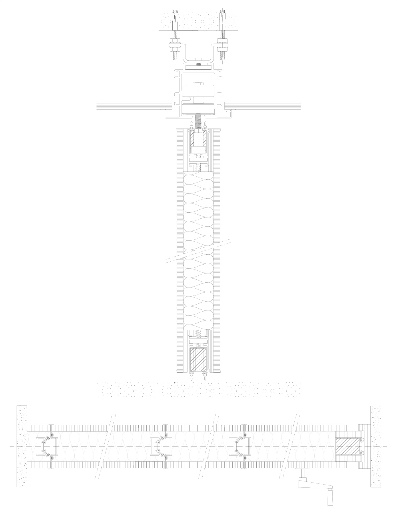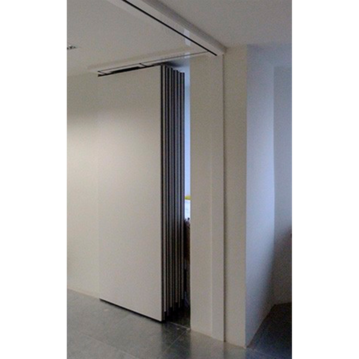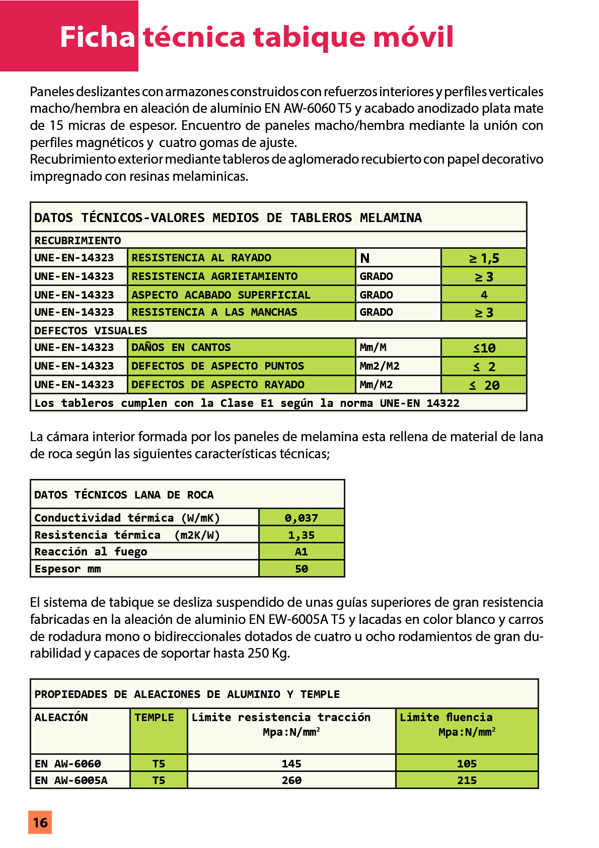 Tabique móvil TabieXpert modelo Tx87 Multidireccional, sin guía en el suelo y con el carril encastrado en el falso techo, compuesto por paneles estándar de entre 850 y 1200 mm. de longitud aproximada cada uno y un panel de cierre telescópico de entre 850 y 1200 mm. de longitud aproximada. Deslizables por un carril superior de aluminio extrusionado anodizado y lacado, integrado en el falso techo, anclado al forjado mediante tacos de expansión ó soldadura que permiten fijar la pletina de nivelación superior a la estructura y descolgar la guía mediante dos varillas roscadas que sujetan la pletina de nivelación inferior a la que va fijada la guía; con dos poleas por módulo formadas por un doble rodamiento polimérico cada una y que, mediante tornillo roscado, facilita el cuelgue y movimiento del mismo; cada panel está fabricado con una estructura autoportante de acero y aluminio que le confiere rigidez y resistencia, en cuyo interior se ubican los mecanísmos telescópicos y el aislante acústico constituido por lana de roca de 60kg/m2. En sus caras exteriores se incluyen dos tableros de partículas de 16 mm. de espesor y acabado a determinar por la D.F. según proyecto. Módulos con mecanísmos internos telescópicos de traviesas móviles superiores e inferiores accionados mediante un giro sencillo de llave, con juntas acústicas de neopreno horizontales y verticales que garantizan un sellado acústico y con bandas magnéticas verticales que favorecen una perfecta unión entre módulos; i/p.p. de estructura auxiliar de cuelgue y barrera fónica entre la guía y el forjado, totalmente colocado y funcionando. Panel de puertas simple de 1120 mm. de longitud aproximada e idéntico acabado al resto del tabique (opcional).