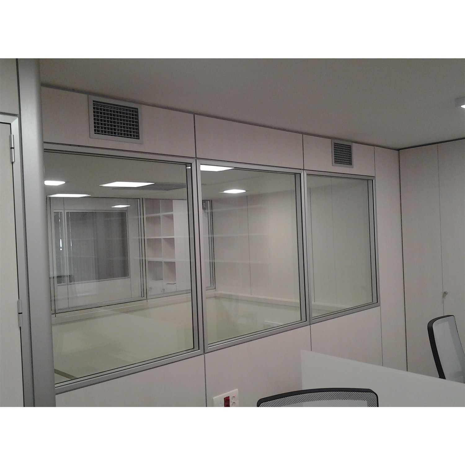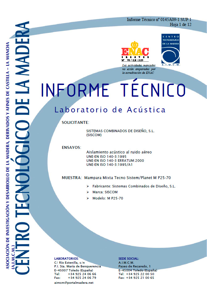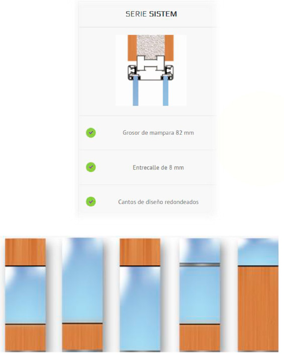Parte ciega compuesta por estructura con perfiles de aluminio de 65×17 mm de espesor Perfil en “U” de suelo y techo de aluminio de 68×30 y 0.6 mm. de espesor. Revestido con paneles de 16mm en bilaminado con cantos de pvc de acabado a elegir del catalogo. Incluye aislamiento con lana de roca con 40mm y 30kg/m3 de densidad, Rodapié y rodatecho con fosa de 20mm con suelo y techo. Entrecalles verticales de 8 mm entre paneles de modulación estándar de 1000 mm.