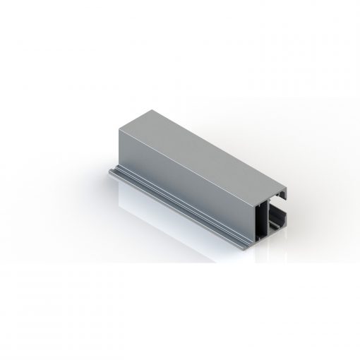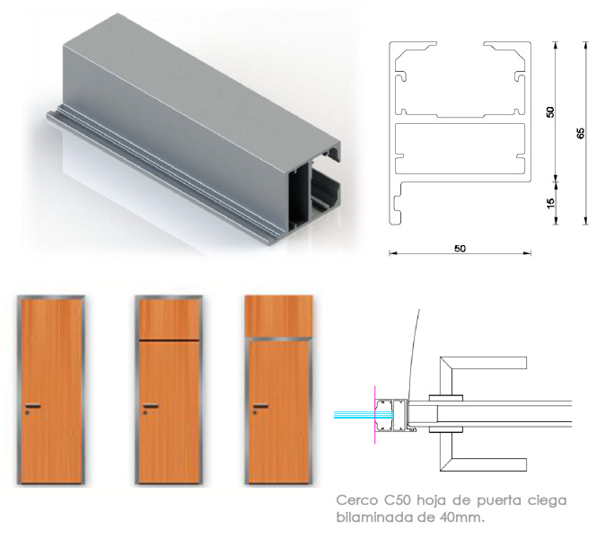Módulo de puerta compuesto por cerco C50 de aluminio anodizado natural provisto de burlete isofónico. Hoja ciega bilaminada de 40 mm de espesor. Manilla, cerradura y bocallave acabado acero inox. Pernios de aluminio. Posibilidad de hoja completa, rasgada o con montante superior.