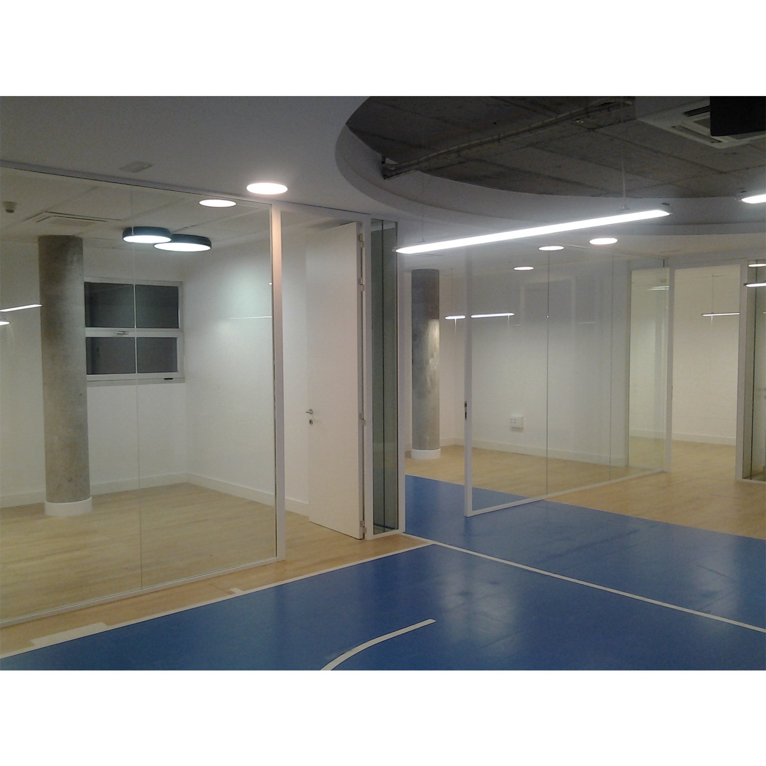 Módulo de puerta compuesto por cerco C50 de aluminio anodizado natural provisto de burlete isofónico. Hoja ciega bilaminada de 40 mm de espesor. Manilla, cerradura y bocallave acabado acero inox. Pernios de aluminio. Posibilidad de hoja completa, rasgada o con montante superior.