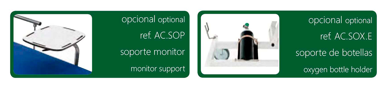 - Accesorios disponibles: soporte porta botellas de oxígeno y bandeja porta objetos (ref. AC.SOX.D y AC.BJ)