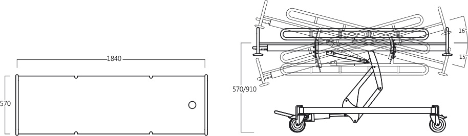 - Camilla con sistema trendelemburg y antitrendelemburg, mediante resorte de gas con accionamiento manual frontal