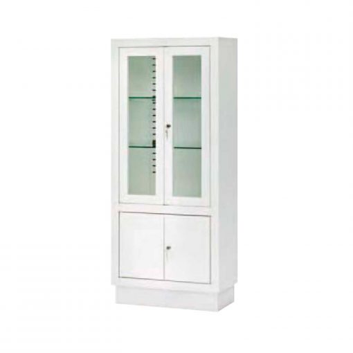 - Parte superior con dos puertas con cristal y cerradura con llave y dos entrepaños regulables de cristal